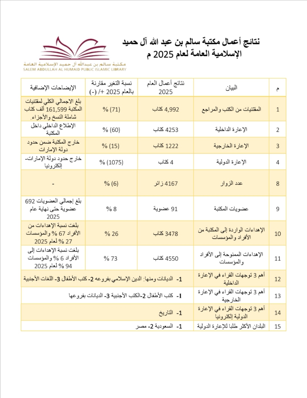 مكتبة سالم بن عبدالله تعلن نتائج أعمالها لعام 2025